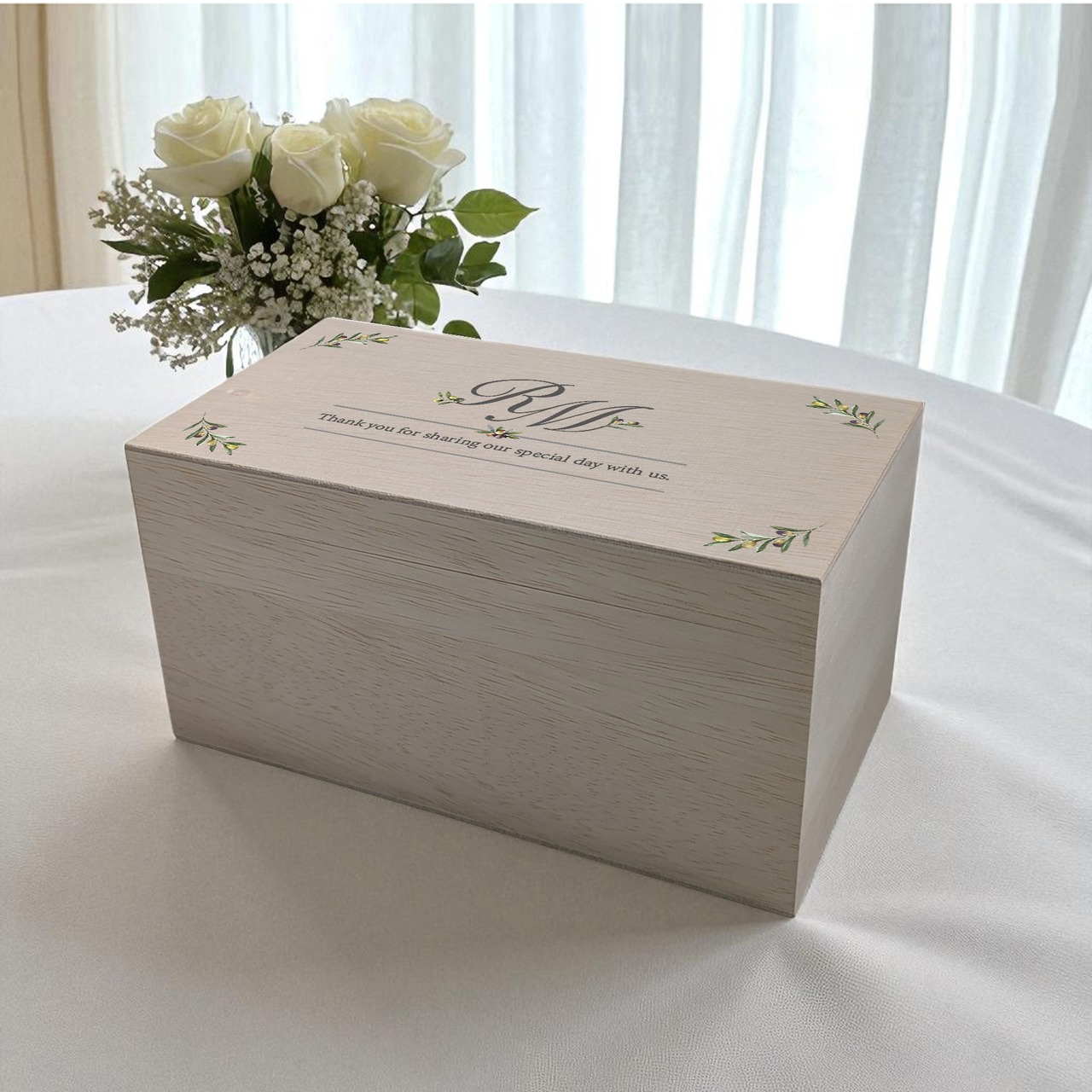 新郎新婦のイニシャルと英文のメッセージをプリントしています。