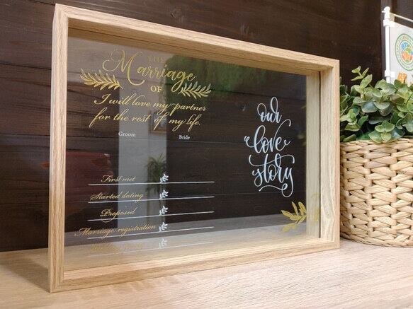 挙式やフォトウェディングで署名をしたあとは、写真を入れて新居に飾って楽しめます。フレームの中で文字が浮いているように見えてとってもおしゃれ!シンプルなデザインなのでお部屋や玄関にさりげなく合います。