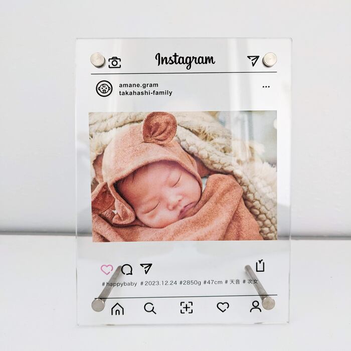 インスタ風のお洒落なデザインで、赤ちゃんの写真を飾るのに最適です。透明度の高いアクリル素材で、写真をより美しく引き立てます。手頃な価格でママ友へのプレゼントにもおすすめです。